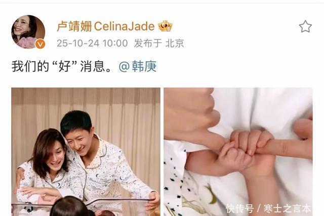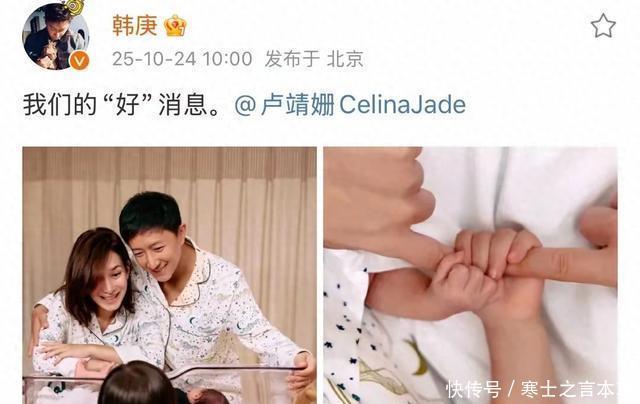 10月24号韩庚和卢靖姗同步晒出消息,一句“我们的‘好’消息”直接官宣二胎生了儿子,大女儿加小儿子正好凑成“好”字,圆满得让人羡慕。